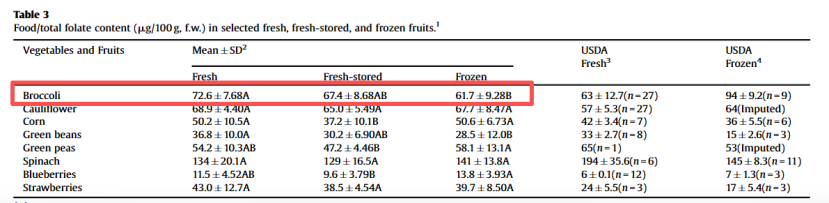 新鲜样品更高(72.6微克/100克),冷藏储存的稍低(67.4微/100克),速冻样品相对低(61.7微克/100克),但三者间的差异并不巨大。