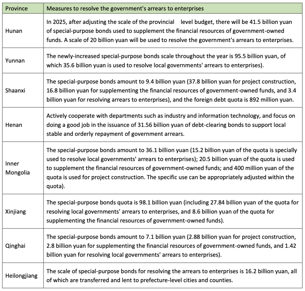 Fiscal and financial tools are being deployed in tandem to expedite the clearance of government arrears to enterprises. The 2025 Two Sessions explicitly allocated a portion of the RMB 4.4 trillion in local government special-purpose bonds to absorb government arrears. Multiple regions adjusted budgets, disclosing dedicated funds exceeding RMB 150 billion for clearing. Concurrently, several national commercial banks launched special loans featuring low interest rates, fast approvals, and extended terms, providing over RMB 80 billion of support for more than 5,000 enterprises to bridge cash flow gaps.