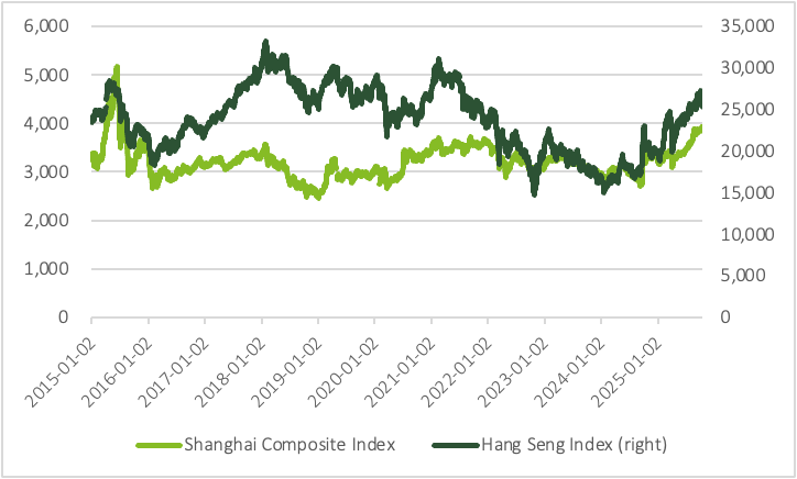 China's economy achieved a 4.8% YoY growth rate in the third quarter of this year. As we have been flagging in previous monthly publications, some slowdown following the torrid 1H (5.3%) would be inevitable for expected reasons — property sector woes (property investment dropped by 13.9% in Jan–Sep 2025) and petering-out export growth (YoY growth rate of 8.3% for September while 4.4% for August). But the 2025 GDP growth target of “around 5%” remains on track. Deflation is not a short-term phenomenon because of the duration of property sector consolidation and pervasive over-capacity in the manufacturing sector.