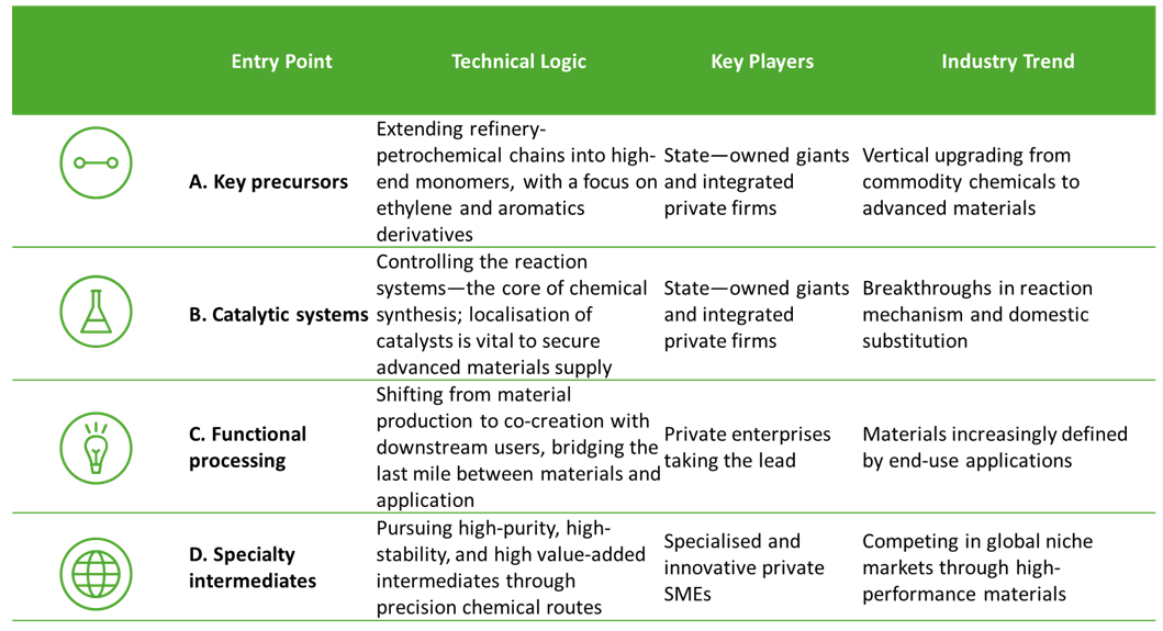 Target chokepoints. Focus on areas with high technical barriers, urgent import-substitution needs and strong customer lock-in. Success in these areas often brings long-term contracts and pricing power. Sinopec and Wanhua Chemical, for instance, have built integrated ethylene-LAO-POE chains, extending upstream to master entire reaction system rather than remaining mere material suppliers.