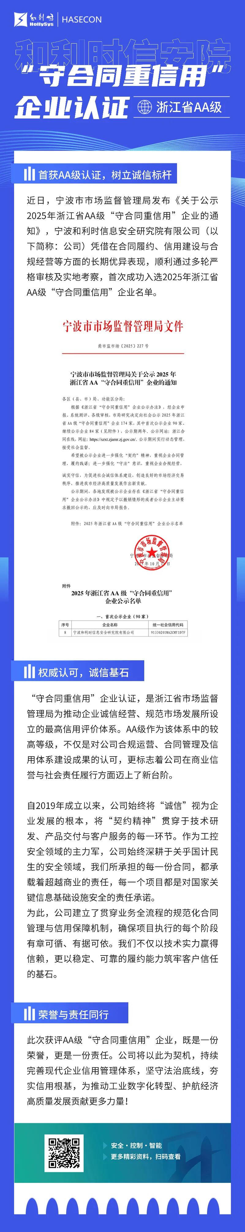 和利时信安院首获浙江省AA级“守合同重信用”企业认证!