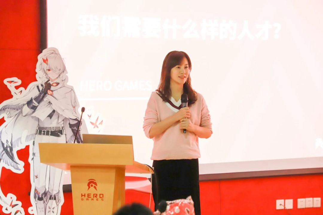 校招HR赵萌萌趁热打铁,结合公司发行业绩与自研工作室的代表作品,将英雄游戏的发展脉络与企业文化娓娓道来,让同学们在直观感受中,对游戏企业的研发实力与运营逻辑有了初步认知。