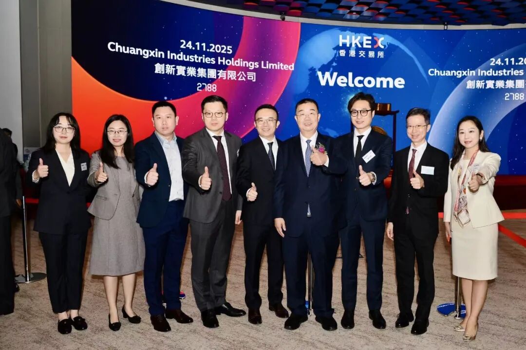 左起:黄宇嘉、方睿、杨旭、赵斌、创新集团副总经理、CFO郭杰斌、崔立新、谢明辉、李俊豪,及创新新材副总经理/董事会秘书王科芳出席创新实业在香港交易所的上市仪式。
