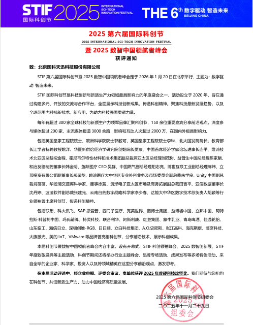 第六届 STIF 国际科创节正式启动,经企业申报,专家评委审议,北京国科天迅科技股份有限公司凭借在高速高可靠通信技术领域的持续攻坚与卓越成就,成功斩获2025 年度硬科技攻坚奖。这一荣誉不仅是对国科天迅技术创新实力的高度认可,更彰显了我国自主可控通信芯片解决方案领域的核心竞争力。