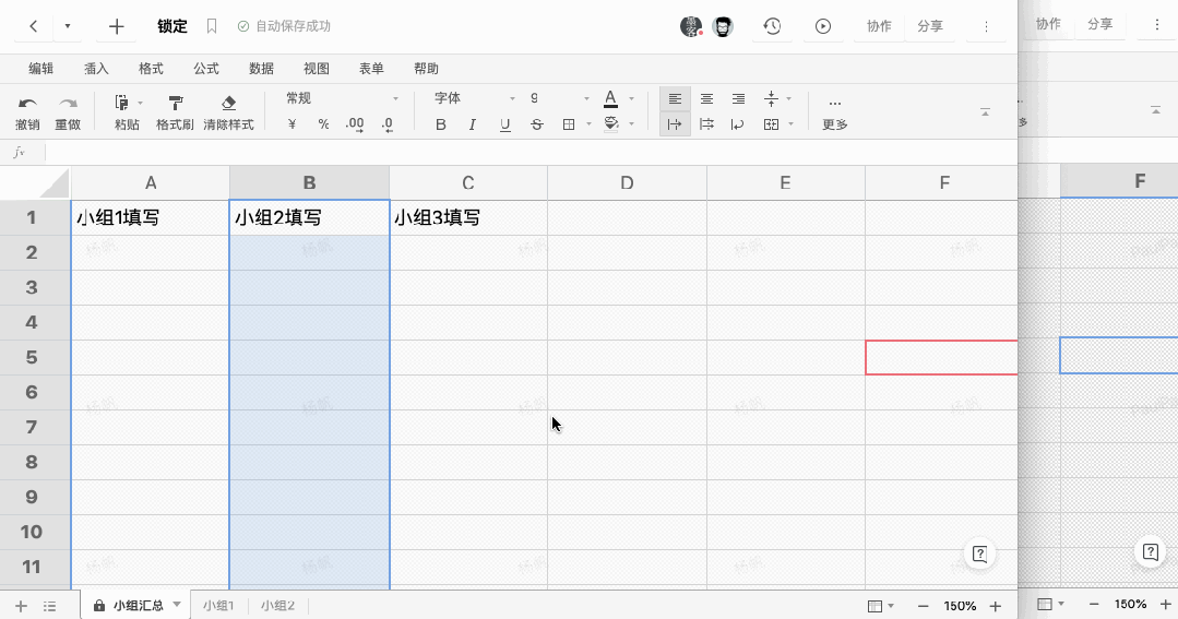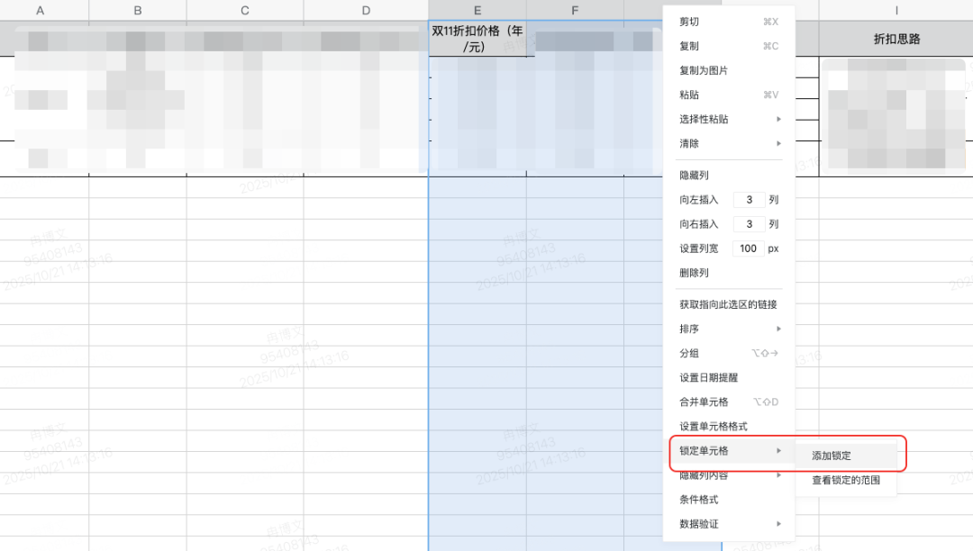 同样,你也可以选中某列、某行后,在菜单中通过「锁定单元格」为选中的整列/行添加锁定,之后该列新增的行/该行新增的列也都会应用锁定。