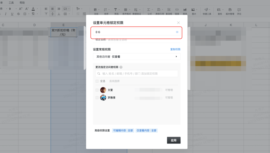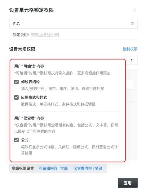 「锁定单元格」可不只是让你能锁定当前单元格,而是以单元格为单位进行任意选定区域锁定,你可以对选中区域为协作者设置不同权限:可以编辑、只能查看、禁止查看,并且可以按照部门直接进行权限锁定。