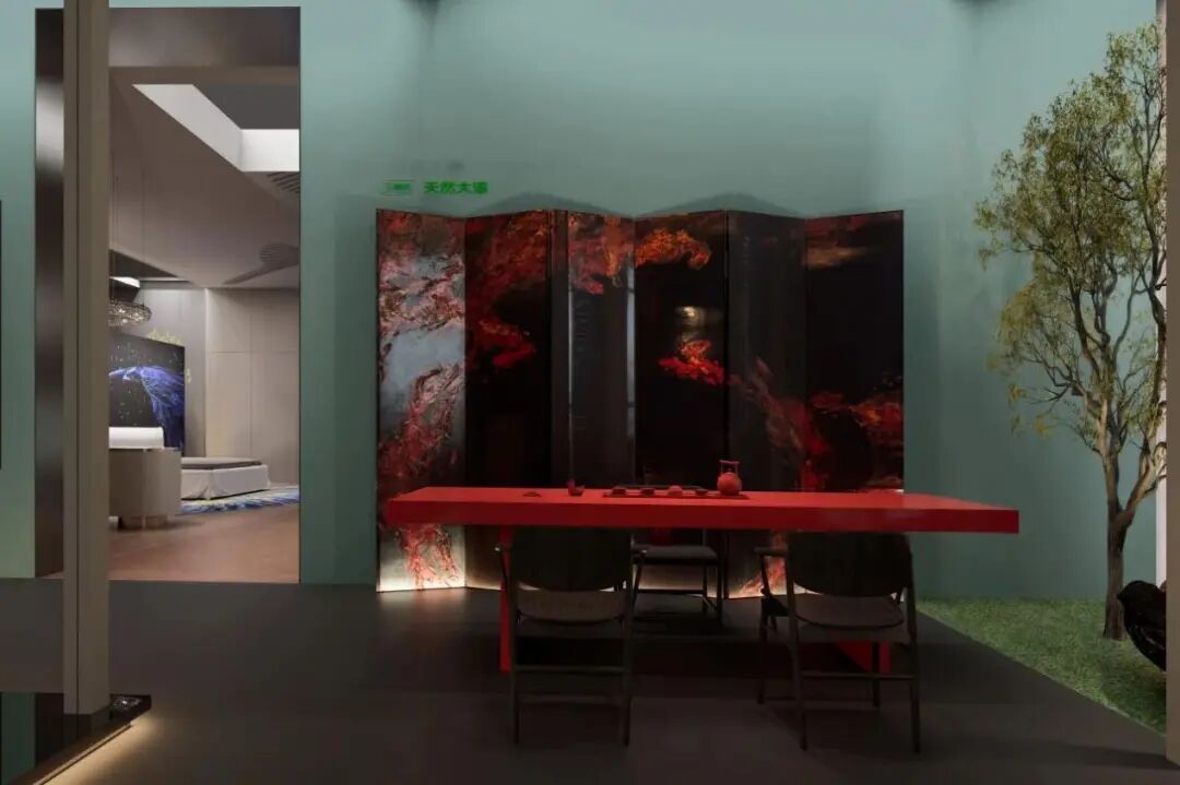 在三棵树展厅中小森板大漆板以智能涂装工艺,纳米级精准复刻传统大漆的温润纹理与深邃层次,融合传统文化与现代审美,金丝婉转,朱华内敛,现场与大漆家具同席陈列,古典气韵与现代健康科技交相辉映,成为观众围观点赞的流量焦点。
