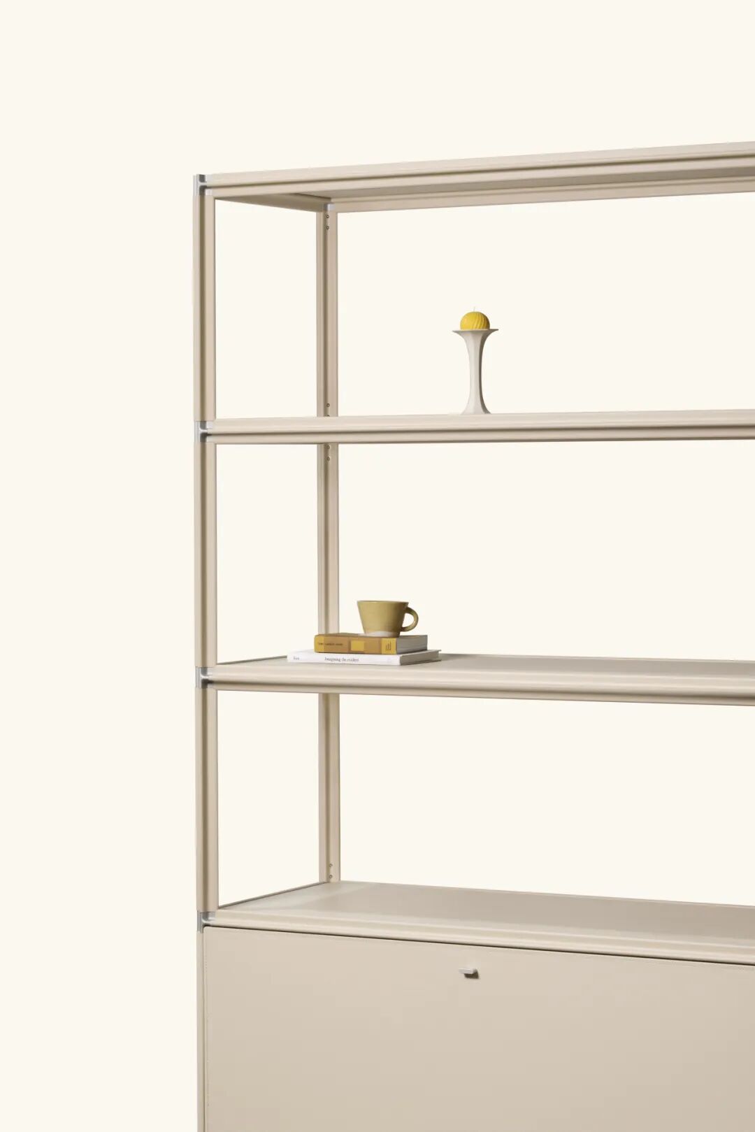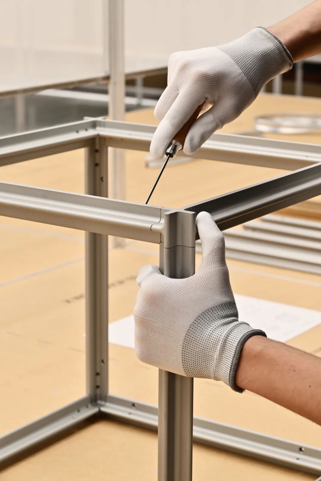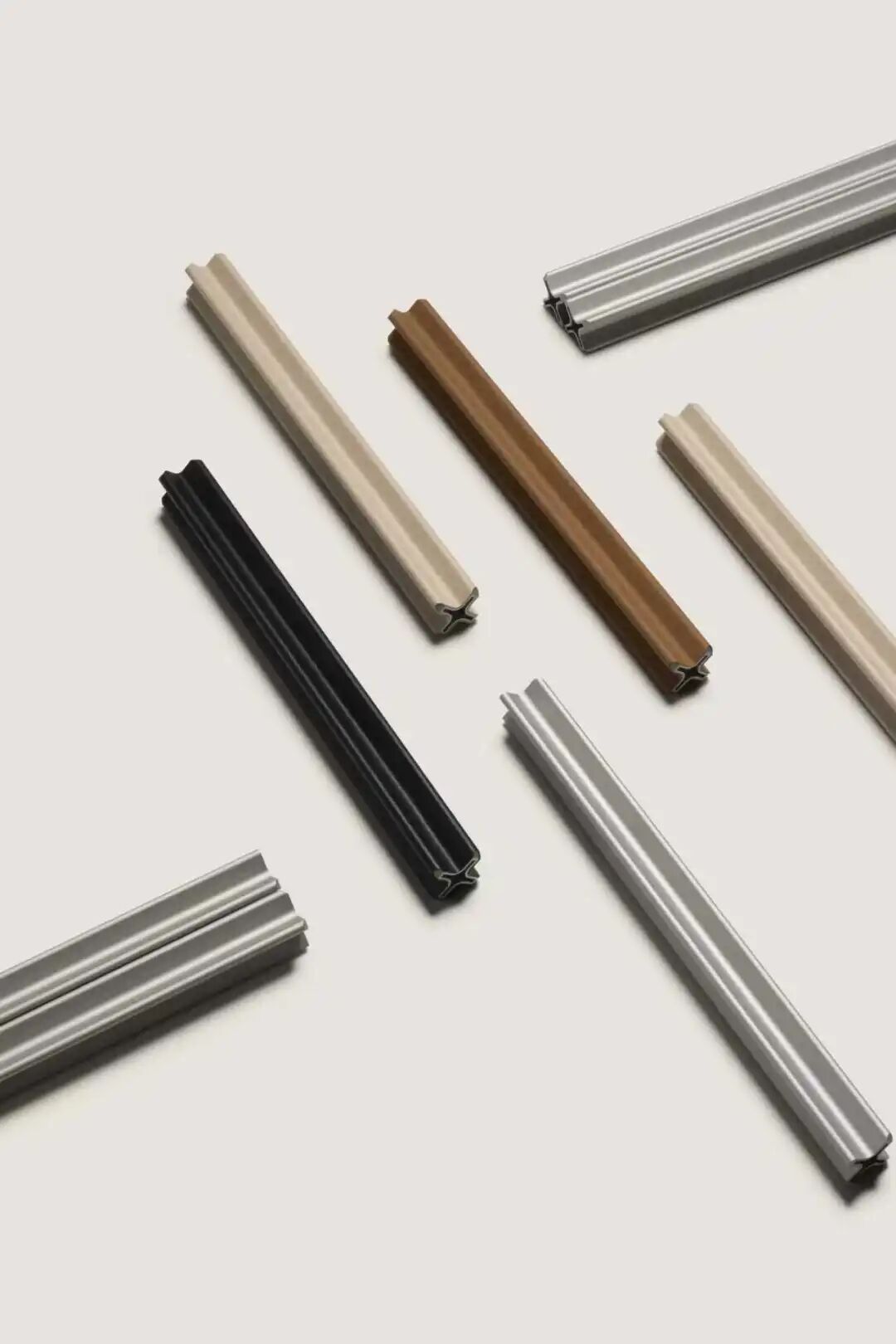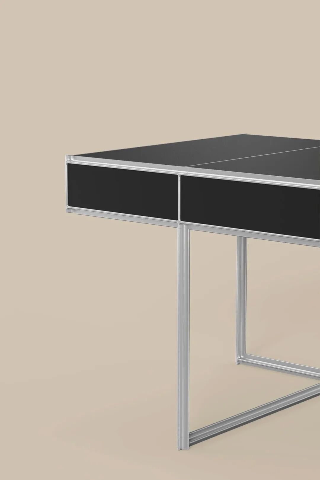 型材线条交错形成X结点,消解了模块化家具点线面构成中的 “点”;线条在视觉上流畅分割画面,兼具简洁感与力量感。铝型材预留的直角空间,既用于固定板材,又便于板材替换,能形成多样组合形式,满足不同审美、功能需求,实现模块化家具的可持续生长。