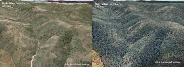贡贝溪国家公园附近一个村庄在2005年(左)和2013年(右)的森林覆盖情况。珍·古道尔研究会在这里推动了森林恢复工作