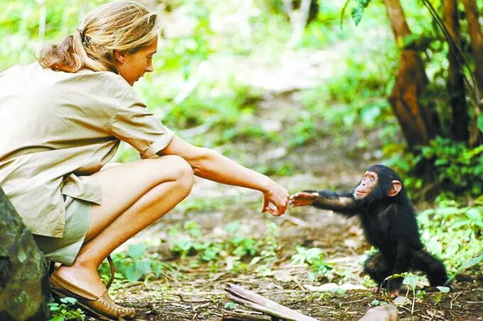 为了不惊扰黑猩猩,她每天清晨在潮湿的灌木丛中匍匐前进,哪怕皮肤被荆棘划破,哪怕被舌蝇叮咬。她穿着颜色单调的衣服,日复一日地坐在山头,忍受着孤独与风雨,只为了让那些生灵习惯她的存在。