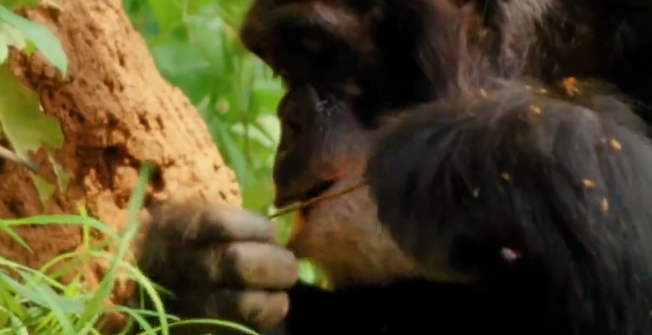 她看到一只被她取名为“灰胡子大卫”的黑猩猩,蹲在白蚁丘旁。大卫摘下一根草茎,细心地摘掉上面的叶子,把它变成一根细长的探针,然后插入蚁穴,钓出了一顿丰盛的白蚁大餐。