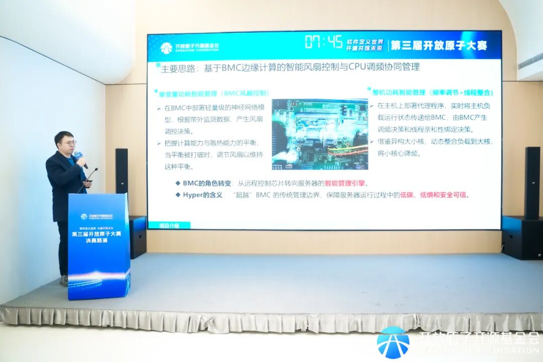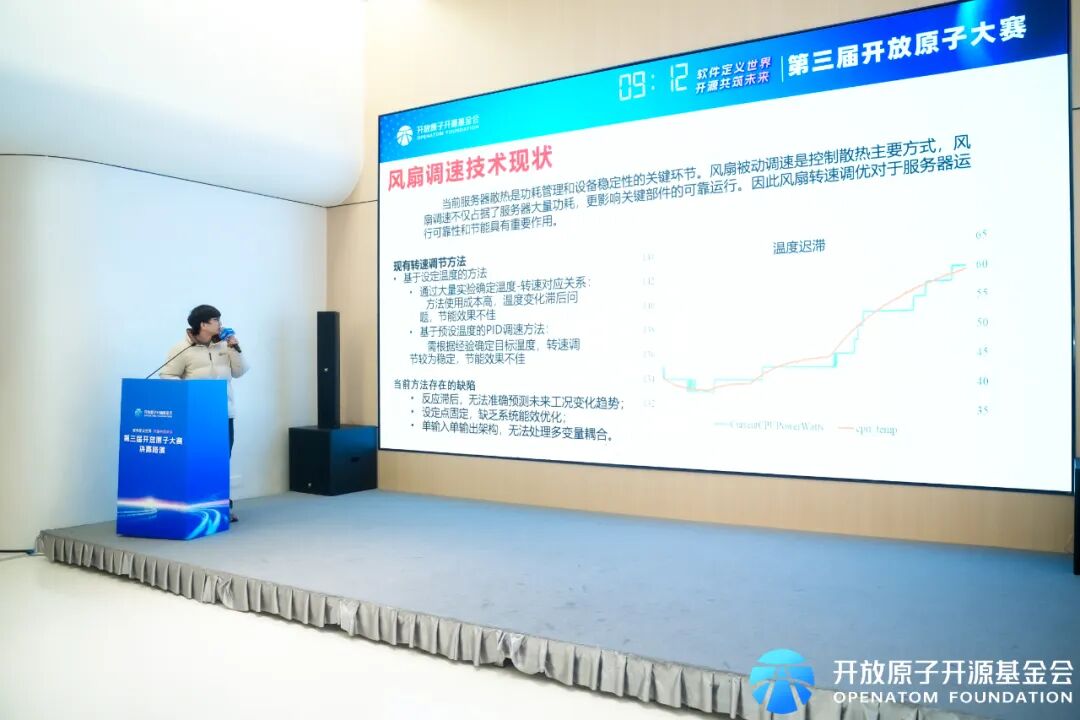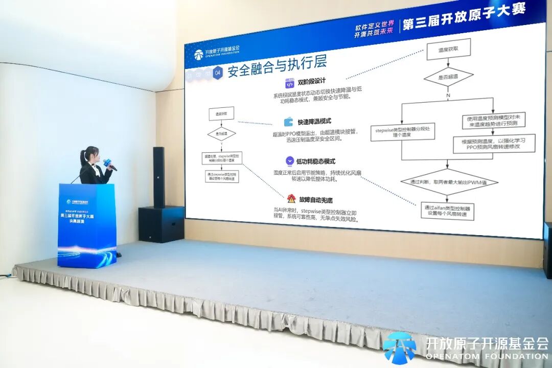 决赛现场,来自第零梯队、创芯无限、国科超算、圈圈圆圆圈圈、竞界智能团队的参赛作品,分别围绕强化学习温控策略、高性能计算场景定制、轻量化AI模型部署、时序预测与决策融合、混合智能调控模式等方向展开创新实践,在OurBMC开源平台上实现了多样化的技术落地与性能优化,展现了国产开源生态中优秀开发者的活跃思维与工程能力。