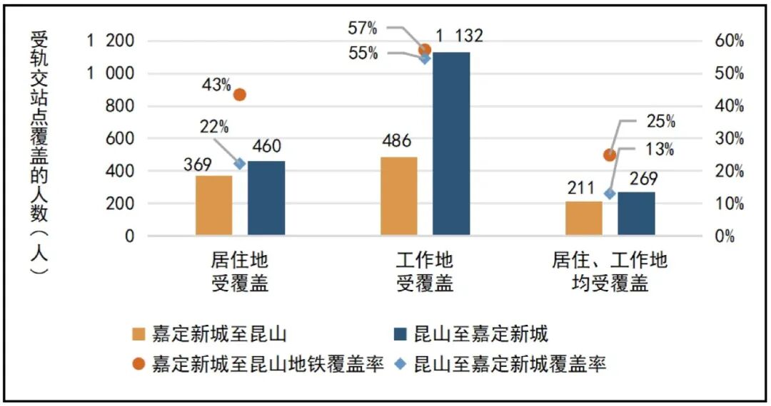 2023年沪苏轨交“双11号线”对接后,对嘉定与昆山的通勤支持愈发显著。目前,超半数流入、流出嘉定新城的通勤者工作地位于“双11号线”站点1km范围内。