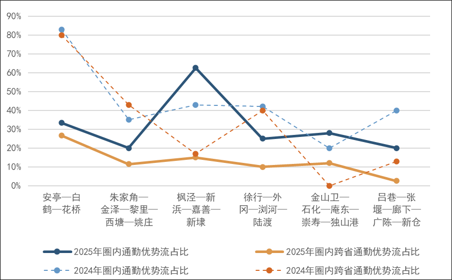 从就业融合方向性来看,部分城镇圈如金山卫—石化—庵东—崇寿—独山港和枫泾—新浜—嘉善—新埭内部的跨镇及跨省通勤联系有所增强,但安亭—白鹤—花桥等区域的跨省优势流占比有所下降,制度性边界在一定程度上抑制了跨省就业网络的扩展。