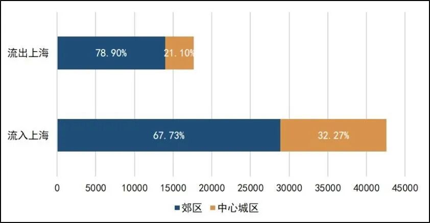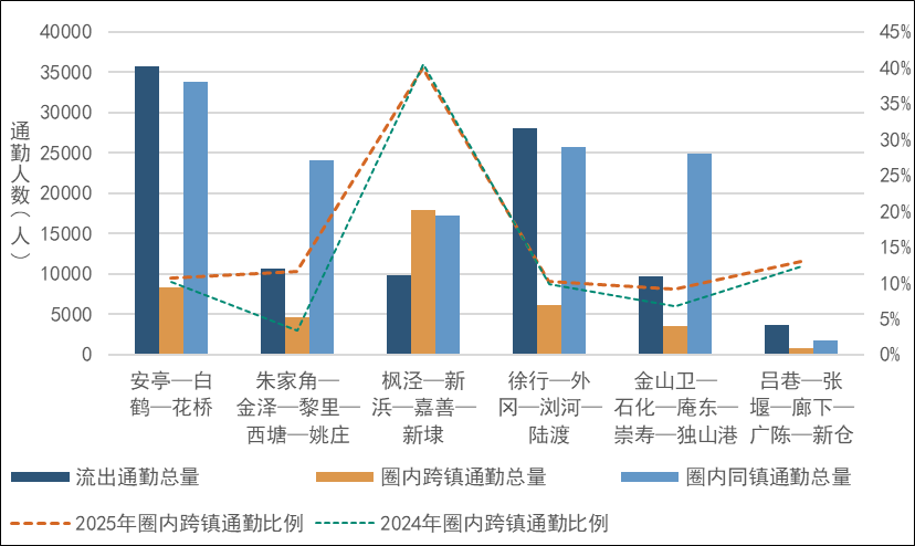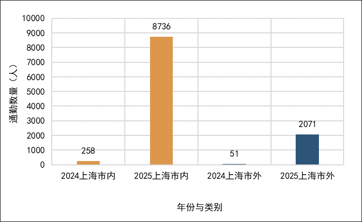 2025年,跨城通勤总人数达到60292人。其中,流入上海市域42615人,流出17677人,入出比为2.41。苏州和嘉兴贡献了绝大多数通勤流入,分别占90.53%和7.66%。上海郊区吸纳的通勤规模较大,占比67.73%,但中心城区单位面积承载通勤密度更高,达到12.28人/km2。