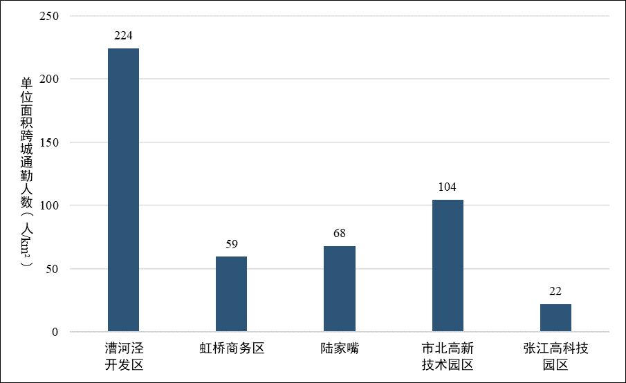 在跨城通勤人数规模上,虹桥商务区作为国家级综合交通枢纽与国际商务中心,跨城通勤总量显著领先。从通勤密度上来看,漕河泾开发区位居首位,体现了其临近周边城市的区位优势、集约的产业布局和较强的对外吸引力。