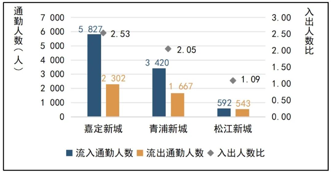 嘉定、青浦、松江三个临界新城的跨城通勤规模持续增长,虽然仍以流入为主,但入出比整体呈下降趋势,说明新城的双向吸引作用正在增强。其中,嘉定新城与近沪地区的联系最为紧密。