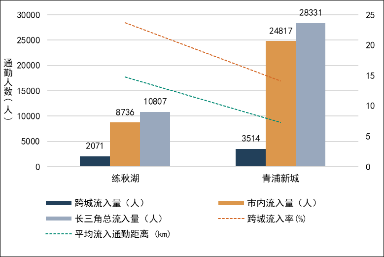 对比同属青浦区的综合性城市节点青浦新城,练秋湖研发中心通勤规模虽较小,但跨城通勤率高达23.7%,远高于青浦新城的14.1%;平均通勤距离约14.7km,是青浦新城的两倍。这表明科创型产业节点具有更强的跨区域集聚与连接能力。