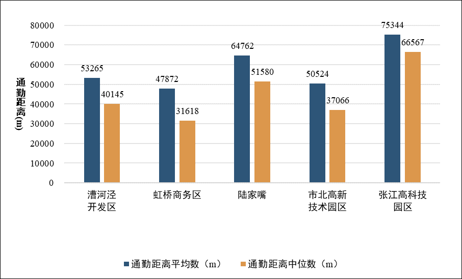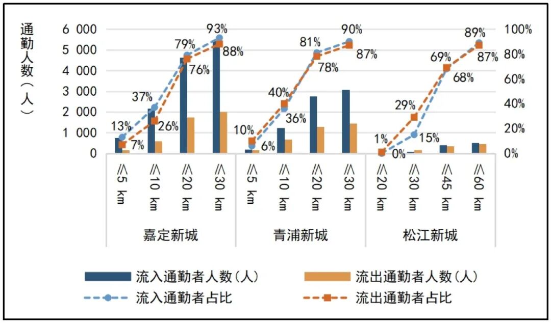 在通勤圈层结构方面,临界新城形成了“近距主导、中远距延伸”的特征。嘉定和青浦以30km以内的短距离通勤为主;而松江新城由于距边界较远,形成了30—60km的通勤圈层。
