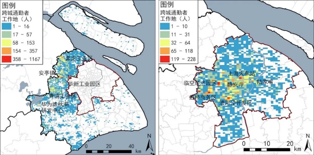 上海跨城通勤的工作热点区域在市域范围内主要集中在嘉定区、青浦区等市域边缘地区,以及南京东路、陆家嘴、虹桥商务区、漕河泾开发区等中心城区核心商务区和商圈,跨区域通勤的目的地在中心城区的热点主要为商务CBD、城市公共中心等功能核心区;郊区热点则为工业园区、高新产业园区等产业集聚载区。