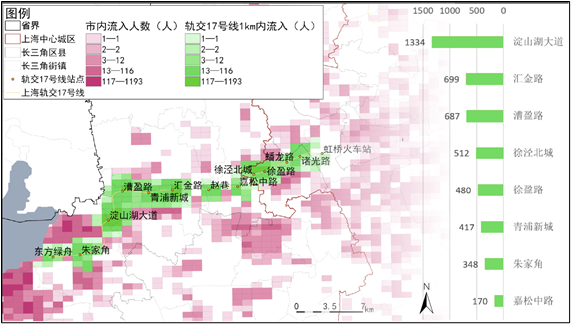 上海轨道交通17号线对练秋湖研发中心的通勤支撑作用显著,近四分之一的通勤者居住在17号线站点1km范围内。17号线西端苏州市吴江区与练秋湖研发中心间通勤联系紧密,具备通过新增轨道交通线路强化支撑、助推区域一体化发展的规划潜力。