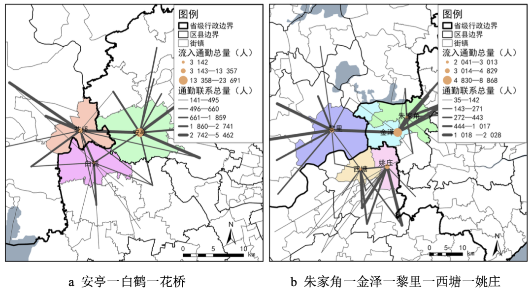 跨界城镇圈的通勤规模差异显著。安亭-白鹤-花桥在圈内通勤总量和流出通勤总量方面仍居首位。