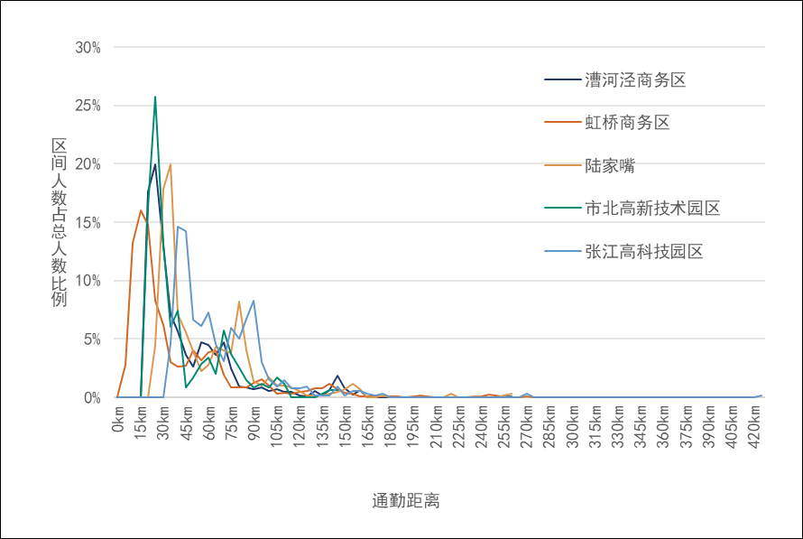 跨城通勤的直线距离与商务区的地理位置密切相关,虹桥商务区平均通勤距离最短,张江高科技园区最长。结合各商务区跨城通勤距离分布,通勤人数随距离增加呈现衰减趋势,表明跨城通勤行为受到空间区位的影响,就业地与居住地之间的地理邻近性是支撑跨城通勤的重要基础。