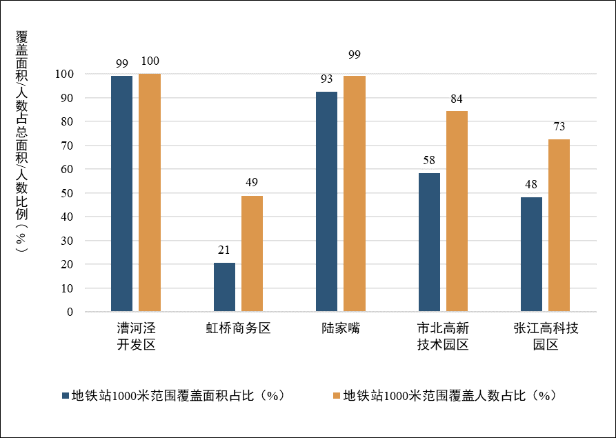 上海市内轨道交通对跨城通勤也起到了支撑作用,但不同商务区的依赖程度有所差异。漕河泾开发区和陆家嘴轨交覆盖率超过90%,为关键通勤方式;虹桥商务区虽通勤人数最多,但轨交覆盖率最低,表明其在上海市内通勤依赖多种交通方式。