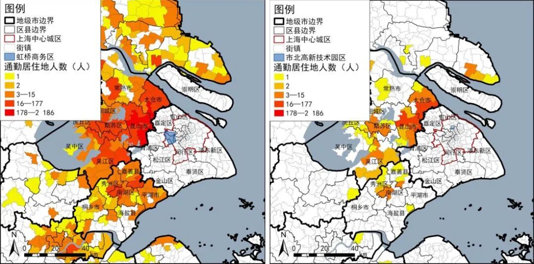 图2-3 虹桥商务区跨城通勤居住地分布(左)