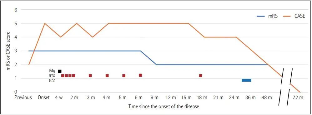 由于患者不符合自闭症谱系障碍(ASD)的全部诊断标准,此次确诊面临较大挑战。患者症状符合可能的自身免疫性脑炎的诊断标准,因此临床医生首先采用静脉注射免疫球蛋白和利妥昔单抗进行免疫治疗,并加用托珠单抗进行免疫调节(图1)。经序贯免疫疗法,患者的幻觉和异常行为完全消失,最终恢复至mRS评分为0分、CASE评分为0分。康复后,她成功进入社会工作场所,成为面包店员工。