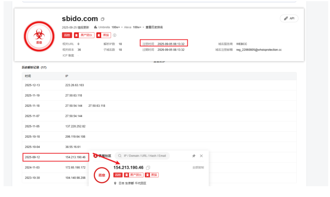 样本使用硬编码的域名作为C2,域名解析IP不定期进行更新,域名sbido.com 在2025-09-0508:13:32被注册使用,通过历史解析IP进行查询从2025-09-12后,解析的IP地址都为“黑猫”团伙所使用: