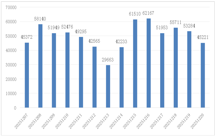 通过监测分析发现,我国境内于2025年12月7日至20 日期间,“黑猫”黑灰产团伙通过案例木马投放导致主机被控数量约 27.78万台,境内日上线肉鸡数量最高达62167台,肉鸡C2日访问量最高达43.77万次。境内日上线肉鸡数量情况如下图所示。