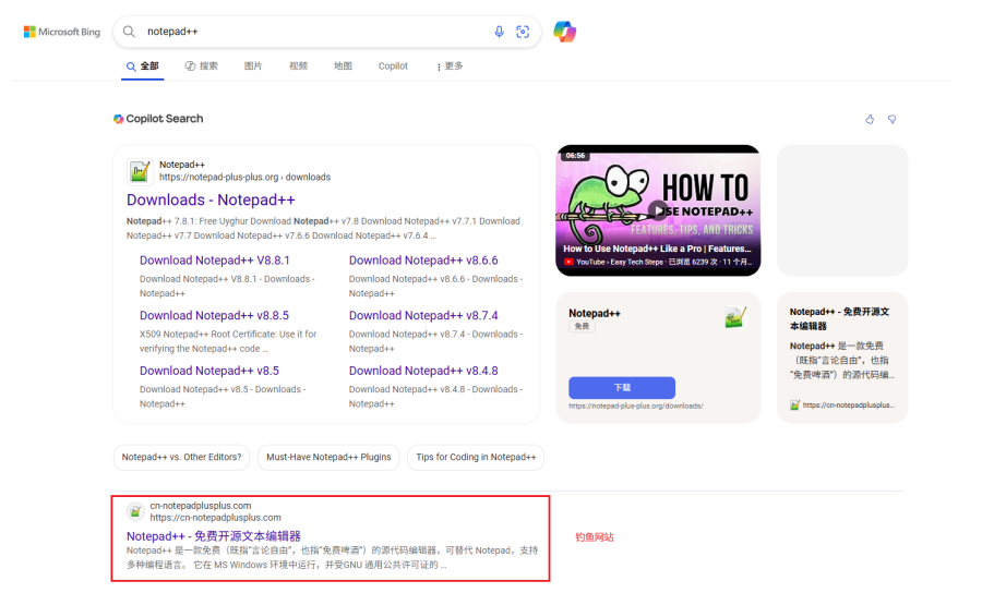 “黑猫”团伙将精心构造的钓鱼网站的在搜索引擎排名进行优化,用户通过在搜索引擎搜索关键词Notepad++后,访问了搜索引擎排行第二的搜索结果,实际为“黑猫”团伙构造的钓鱼网站,经过诱导下载后,用户下载了含有后门程序的软件安装包,安装后会释放后门文件,从而被攻击者远控。