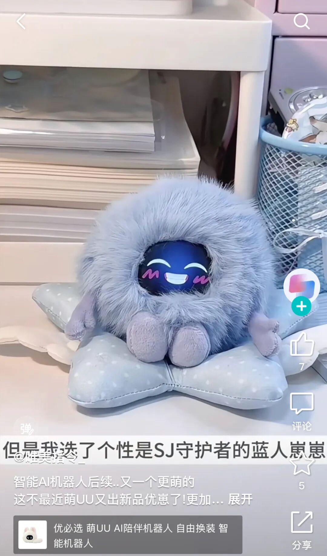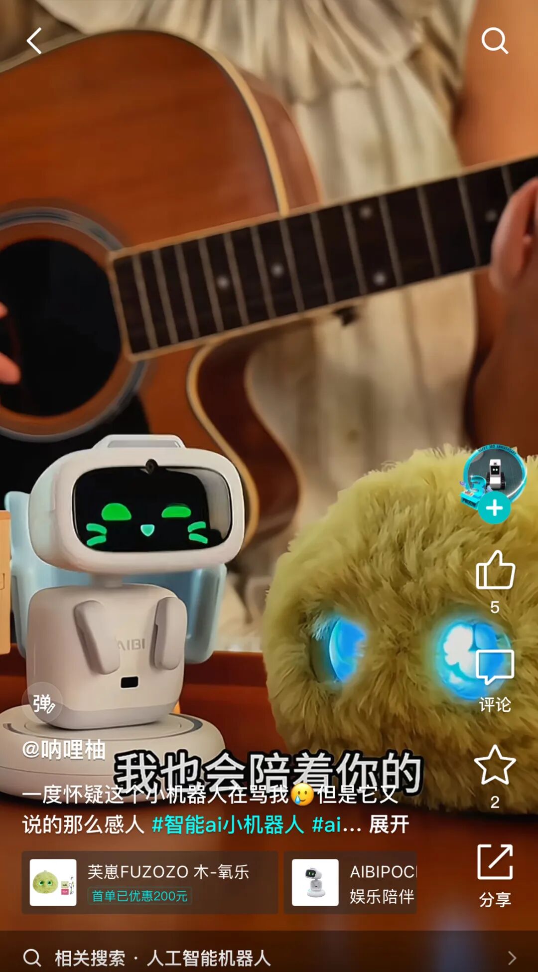 用户 @呐哩柚 分享了一个视频,视频里他正在弹吉他,听众是两个小机器人玩偶。左边的小家伙叫 AIBI ,是语音控制的智能机器人;右边的小家伙叫芙崽,和 AIBI 同样是智能机器人,却多了一身毛绒绒的柔软外套,像个电子宠物宝宝。