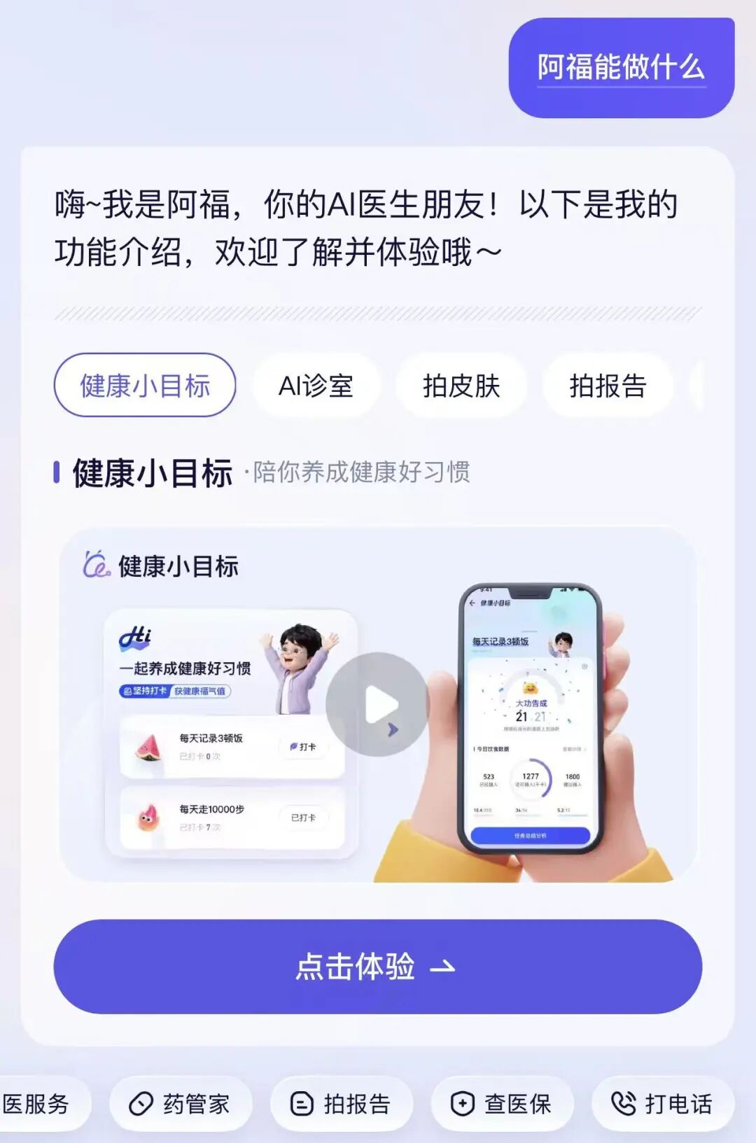 从基本功能看,阿福可以提供健康小目标、AI 诊室、拍皮肤、拍报告、拍药盒、智能体沟通、归纳健康档案,简单归纳为三类: