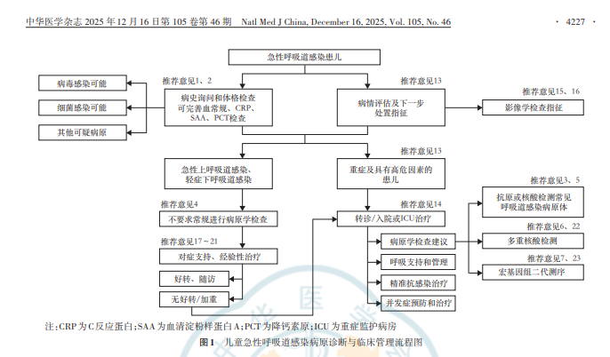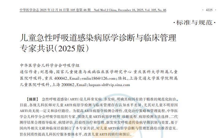 近日,《中华医学杂志》正式发布《儿童急性呼吸道感染病原学诊断与临床管理专家共识(2025 版)》。该共识由中华医学会儿科学分会呼吸学组组织相关专家,围绕儿童急性呼吸道感染(ARTI)的病原学初判、诊断流程、病原检测方法选择等议题编写,给出相关推荐意见,并共同制定了“儿童急性呼吸道感染病原诊断与临床管理流程”,为儿童ARTI的精准诊疗提供了权威指引。