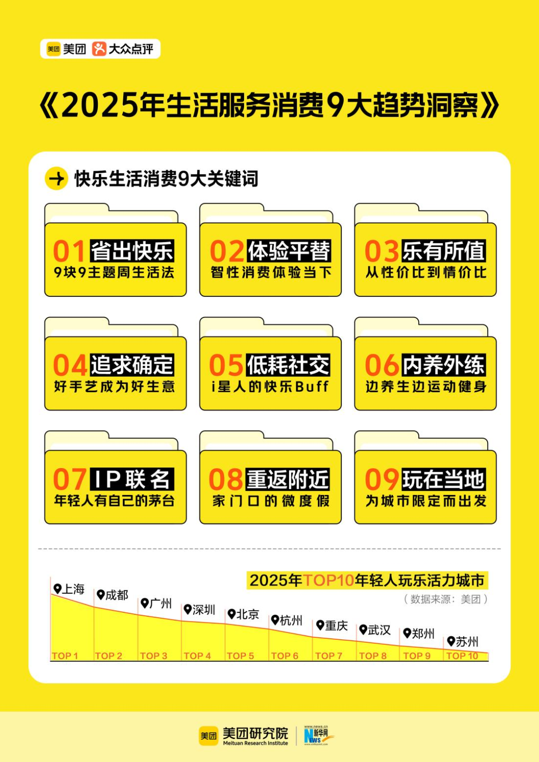 1月21日,新华网联合美团研究院发布《2025生活服务消费趋势洞察》(以下简称:报告)。2025年,美团APP上与快乐生活相关的服务消费订单量同比增长36%,95后消费者占比近6成,上海、成都、广州、深圳、北京、杭州、重庆、武汉、郑州、苏州位列TOP10年轻人玩乐活力之城。据报告,2025生活服务消费九大关键词为:省出快乐、体验平替、乐有所值、追求确定、低耗社交、内养外练、IP联名、重返附近、玩在当地,提供新奇感、释放压力、彰显态度的“情价比”消费悄然崛起。