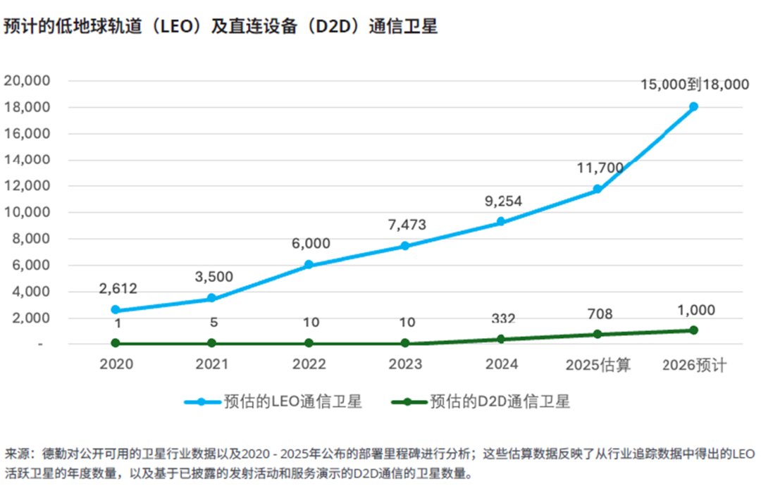 德勤此前曾预测,2024年直连设备(D2D)网络基础设施(主要为卫星)支出为30亿美元,但实际已达约40亿美元,预计到2026年将增至60亿至80亿美元。德勤同时预测,约1,000颗D2D卫星将为缺乏地面蜂窝网络覆盖的区域提供低带宽连接服务(SOS紧急呼叫、短信及语音),部分D2D网络更致力于提供高速服务。目前D2D服务的用户接受度与付费意愿仍存在不确定性,这意味着其盈利模式与商业模式尚未明晰。我们进一步预测,到2026年底,低地球轨道通信卫星数量将达到1.5万至1.8万颗,为全球超过1,500万用户提供连接服务。2026年低轨卫星领域的另一趋势是,新兴运营商可能以低成本月度宽带服务冲击新兴市场电信商,而非像部分其他卫星供应商那样与地面电信商合作。
