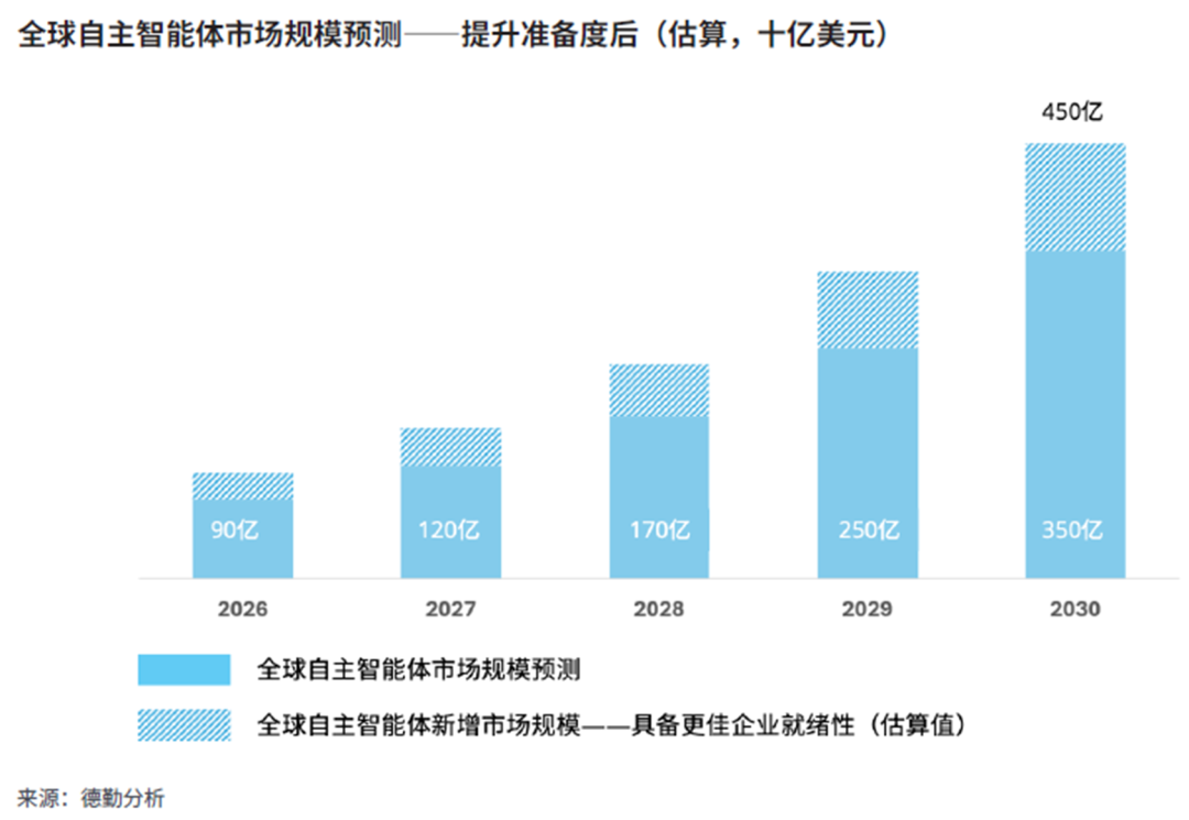 到2026年,估计自主智能体市场规模可能会达到85亿美元,到2030年达到350亿美元。德勤预测,如果企业能够更好地协调代理并审慎应对其相关挑战和风险,到2030年这一市场预期可能会增长15%至30%,高达450亿美元。在2026年,企业可能会努力提升自身在协调具有一定自主性代理方面的能力。与此同时,对于那些注重代理互操作性与管理,并能有效实现在工作流程和人才方面所需变革的企业而言,多代理系统很可能将发挥积极作用。