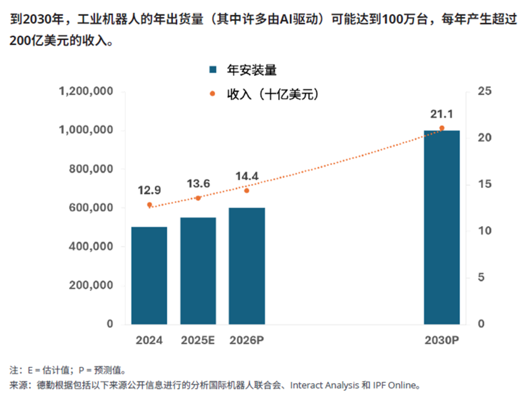 德勤预测,到2026年,全球工业机器人的累计安装量可能达到550万台,但自2021年以来,全球工业机器人年销量始终徘徊在50万台左右。发展拐点可能早在2030年就会出现――届时年度新型机器人出货量将翻倍至100万台,这主要由以下增长催化剂推动:(i) 发达国家专业工业应用中的劳动力短缺,以及 (ii) 计算能力的指数级进步以及专用基础AI模型的出现。机器人可渗透至包括自主无人机在内的多个行业与应用场景,但除非更广泛的技术、人工智能及机器人生态系统能解决数据质量、系统集成和网络安全等瓶颈问题,否则工业机器人市场可能仍将维持在当前相对平缓的年增长率水平。