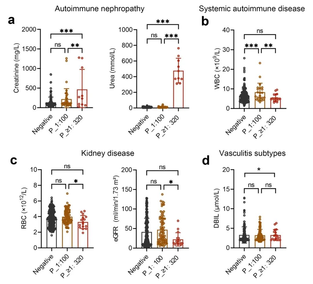为评估AECA滴度的临床意义,在各疾病类别内比较AECA阴性、低滴度(1:100)和中至高滴度(≥1:320)人群的相关实验室指标。结果显示,在自身免疫性肾病中,中至高滴度组的血肌酐和尿素水平显著升高,提示肾功能损害加重(图3a)。在系统性自身免疫性疾病中,中至高滴度组的白细胞计数(WBC)低于低滴度组(图3b)。在肾脏疾病中,中至高滴度组的红细胞计数(RBC)和估计肾小球滤过率(eGFR)均下降,提示贫血与肾功能受损并存(图3c)。在血管炎中,中至高滴度组的直接胆红素(DBIL)水平降低(图3d)。