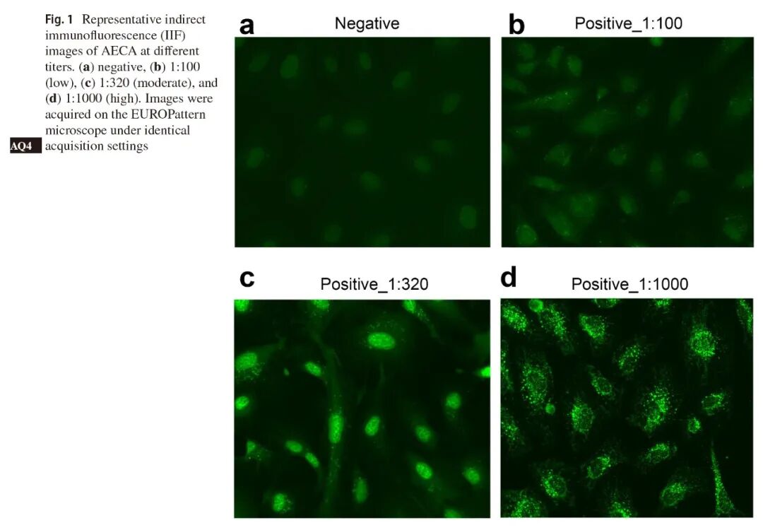 研究采用间接免疫荧光法(IIF)进行检测,将AECA滴度分为低(1:100)、中(1:320)和高(1:1000)三个等级。