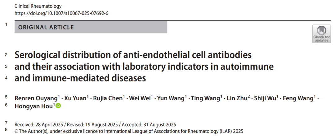 近日,华中科技大学同济医学院附属同济医院检验科在《Clinical Rheumatology》上发表了一项大样本横断面研究,系统分析了1334例血管炎、系统性自身免疫病、肾脏疾病、关节炎及其他免疫介导性疾病患者的AECA血清学特征。研究结果显示,AECA在不同疾病类别中呈现明显的异质性分布,且其滴度水平与多项实验室指标异常密切相关,提示AECA滴度检测可作为评估疾病严重程度及系统性受累风险的潜在血清学指标。