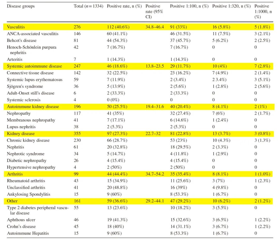 本研究共纳入1334例,按疾病分为6组:血管炎(n=276)、系统性自身免疫病(n=247)、自身免疫性肾病(n=196)、肾脏疾病(n=355)、关节炎(n=99)及其他免疫介导疾病(n=161)。各疾病类别 AECA 阳性率存在差异(表1)。