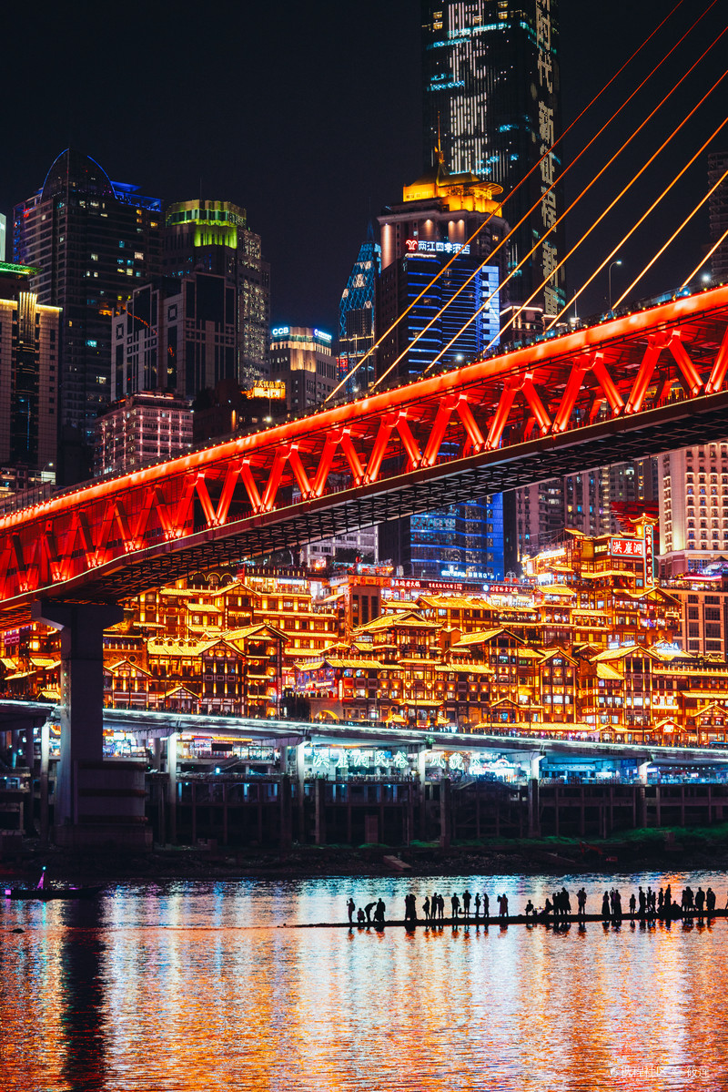 来重庆首先必去洪崖洞夜景,吊脚楼群夜幕下灯火通明,彷佛闯入现实版《千与千寻》的奇幻世界。除了可以在一楼观景台拍照,千厮门大桥及对岸的江滩公园也超出片!