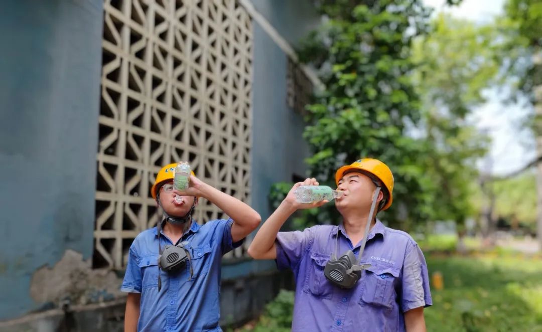 车间为员工提供避暑地,员工们坐在休息桌旁吹空调、喝水,休息片刻后,满血复活再次投入生产