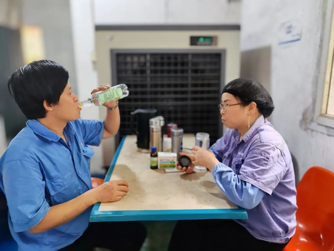 车间为员工提供避暑地,员工们坐在休息桌旁吹空调、喝水,休息片刻后,满血复活再次投入生产
