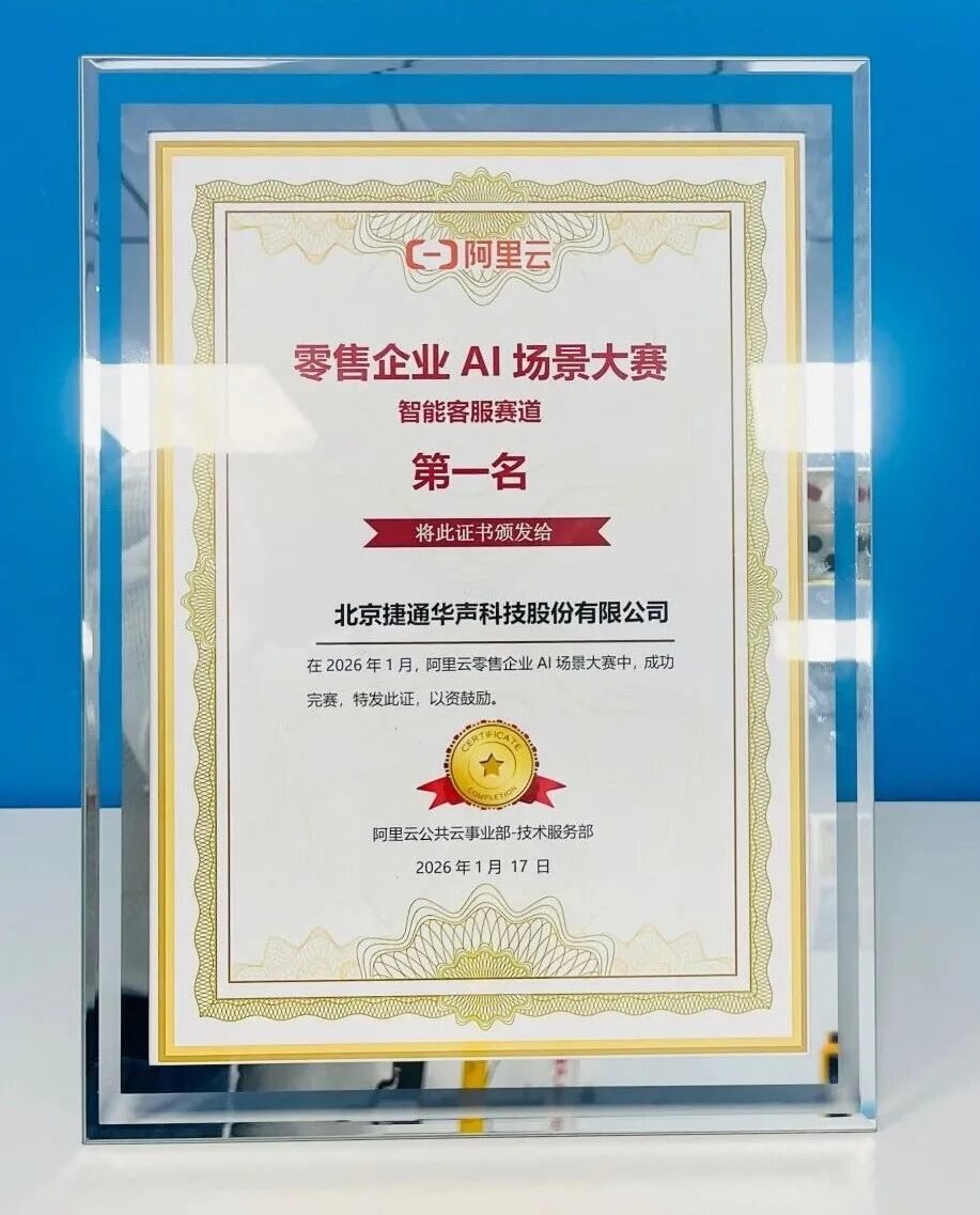 1月17日,阿里云零售AI场景-生态技能大赛在上海徐汇滨江园区圆满落幕。作为国内领先的对话式智能体与垂类模型应用服务提供商,捷通华声凭借自主研发的智能客服智能体,以全维度卓越表现一举斩获“智能客服”赛道第一名,并荣膺阿里云“企业AI场景方案先锋奖”,双重荣誉充分彰显了其在AI领域深耕多年的技术积淀与硬核实力。
