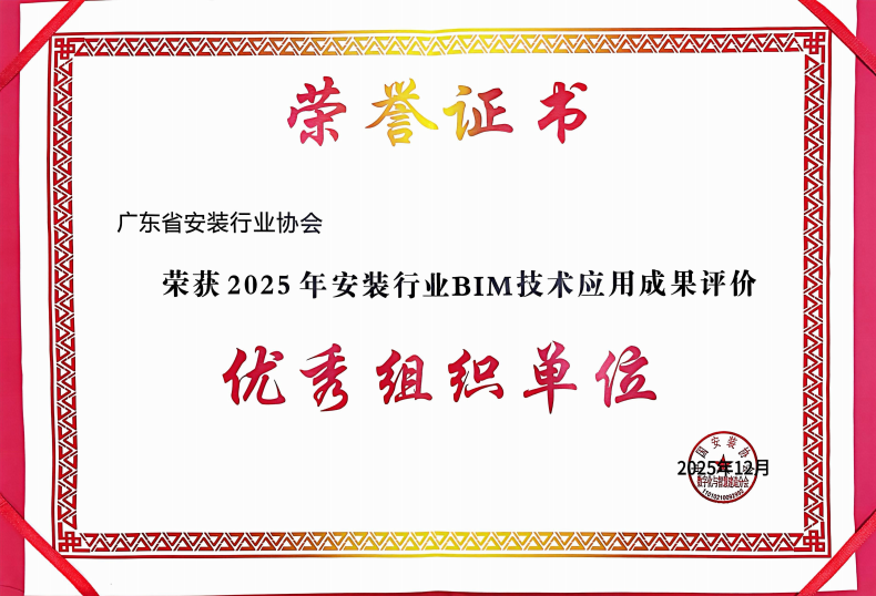 同时,广东省安装行业协会斩获2025年安装行业BIM技术应用成果评价“优秀组织单位”荣誉称号,公司作为协会会长单位与协会共同见证这份荣誉。
