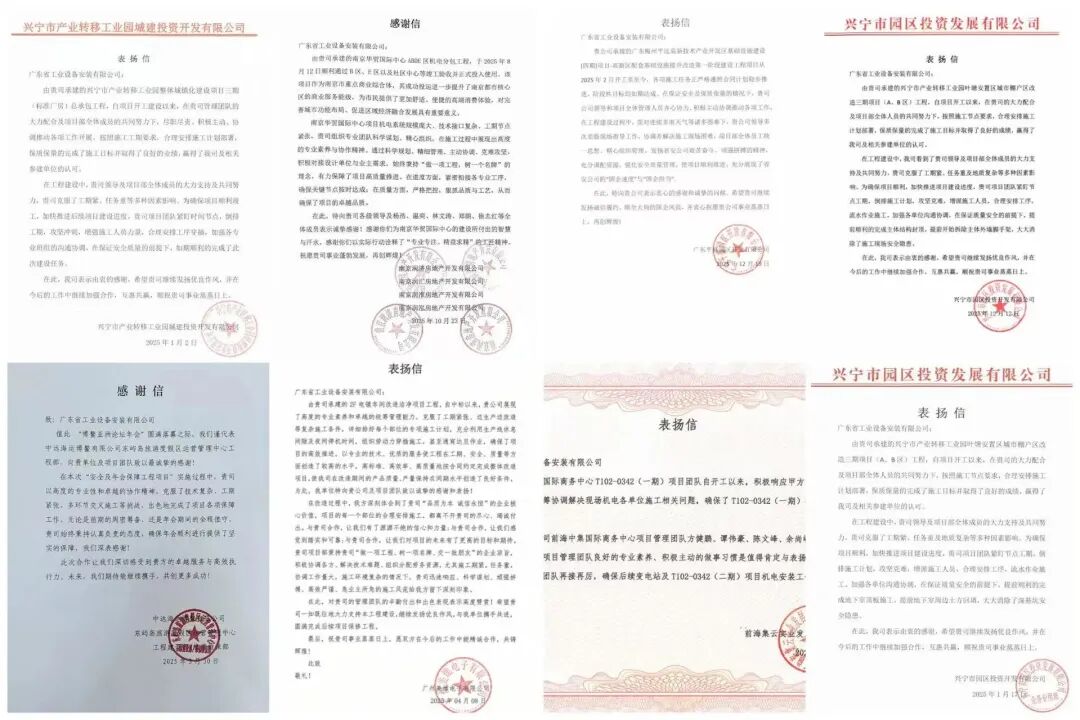 2025年,公司以优质服务、精品工程赢得了业主的高度赞誉,收到了来自广州美维电子有限公司、中远海运博鳌有限公司、前海集云实业发展(深圳)有限公司等业主单位发来的表扬信、感谢信13封。